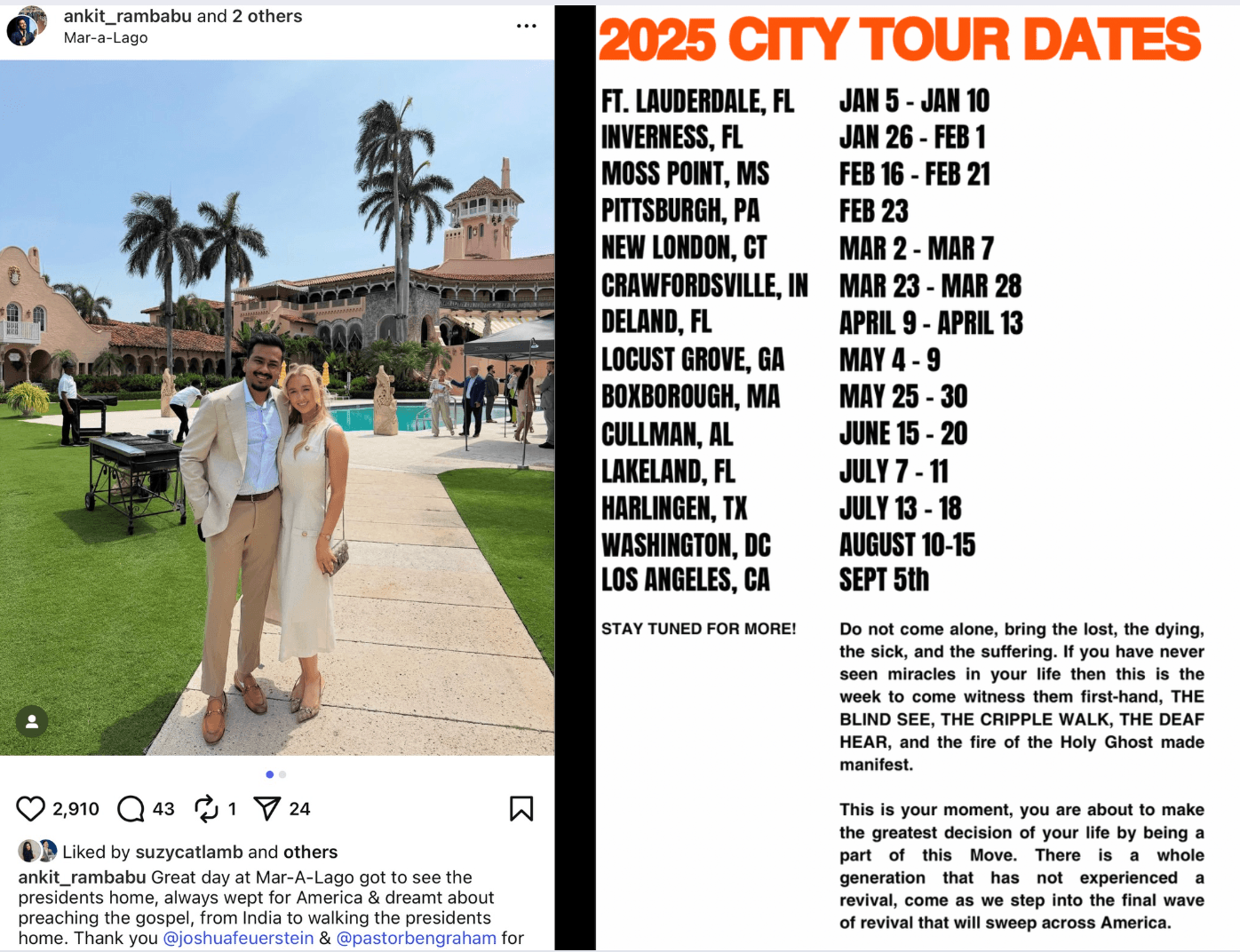 Ankit & Jessica Rambabu visiting Mar-A-Lago (left) and ARB 2025 tour schedule (right.)