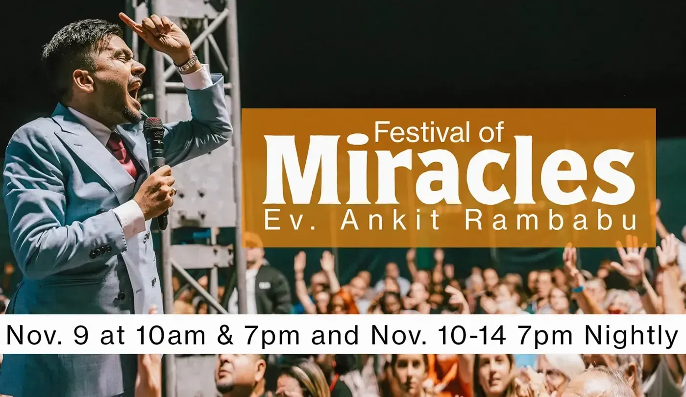 Advertisement promoting a Festival of Miracles event with Ankit Rambabu.