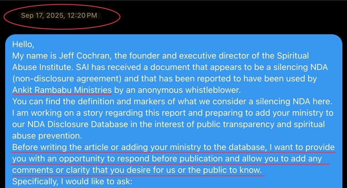 Ankit Rambabu Ministries was contacted on September 17, 2025, and we followed up on September 30th. Here are the specific questions we asked; we also invited them to share any comments or clarifications they wanted SAI or the public to know.