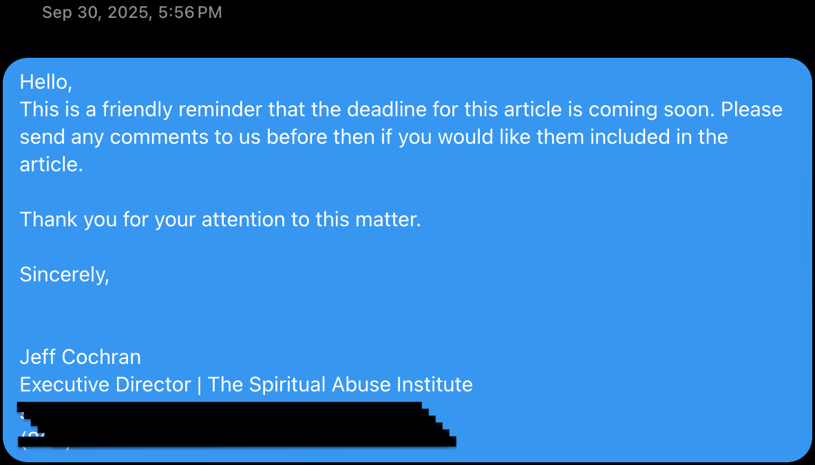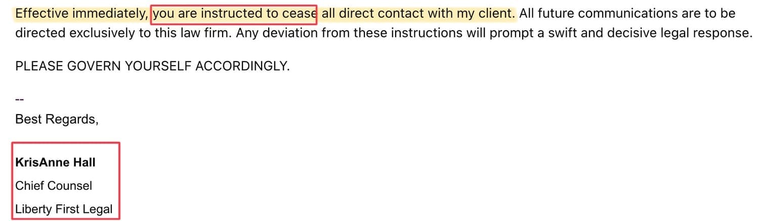 “To my knowledge, you have never been an employee of ARB Ministries, nor have you executed an NDA with this ministry. I am further unaware of any allegation of criminal conduct involving ARM Ministries, yourself, or your organization that would justify the tone or substance of your communications.”