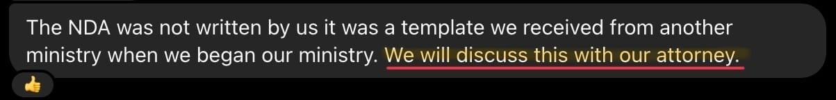 The mutual connection then shared our response with Jess. Her response was reportedly: “The NDA was not written by us it was a template we received from another ministry when we began our ministry. We will discuss this with our attorney.”