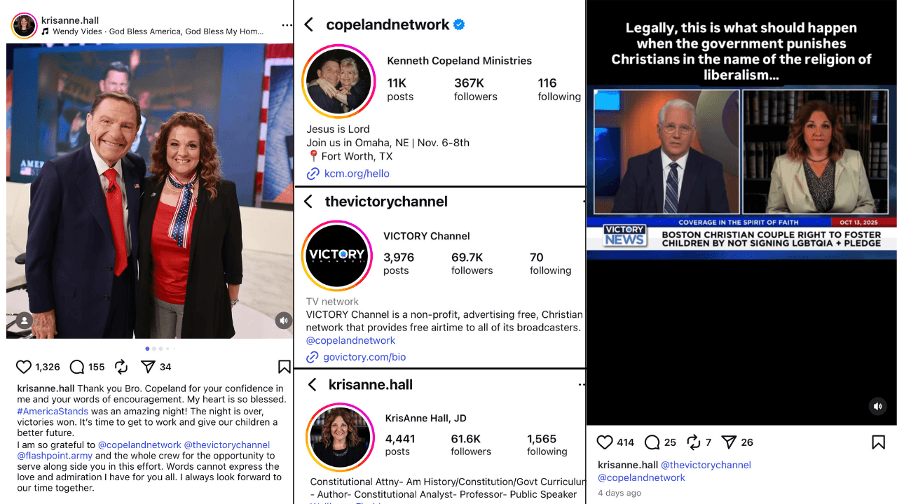 LEFT: Attorney KrisAnne Hall with Kenneth Copeland. CENTER: Social media audiences for Kenneth Copeland Ministries,